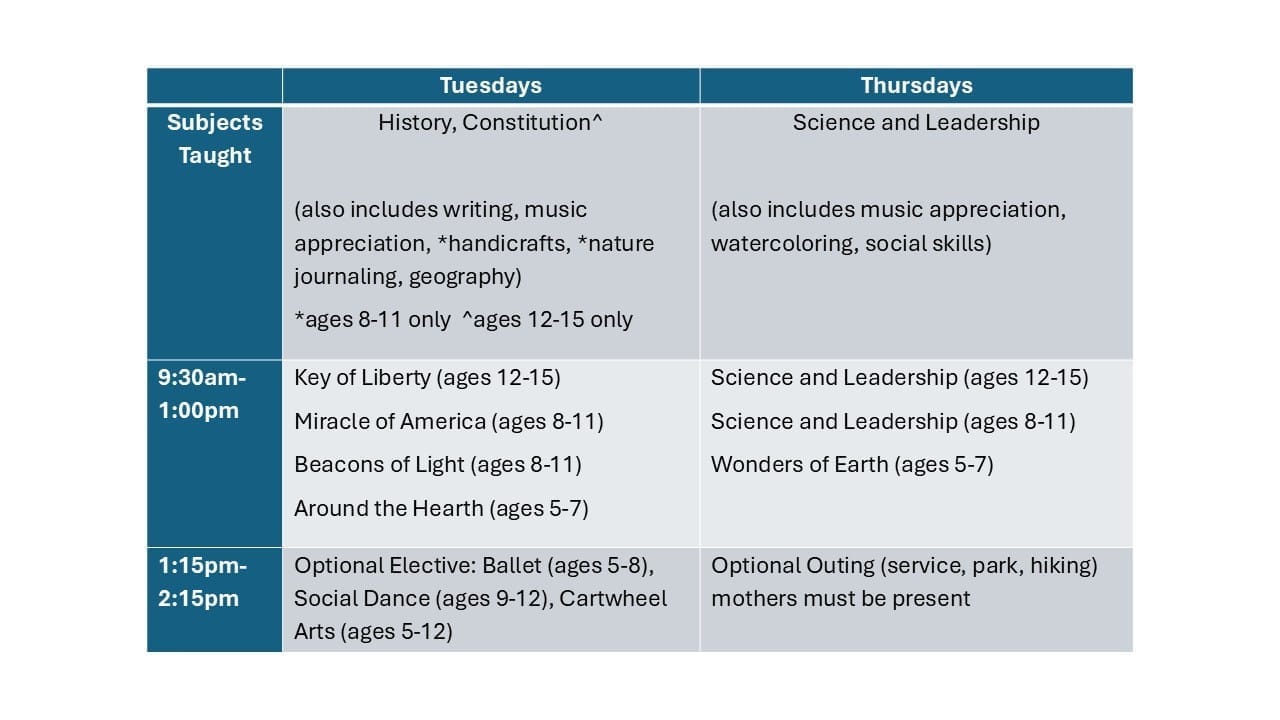 Our story-based leadership class will inspire students to center their lives on true and enduring principles as they learn about great men and women. They will also set goals and have an accountability partner. They will study science with many hands on projects and experiments.