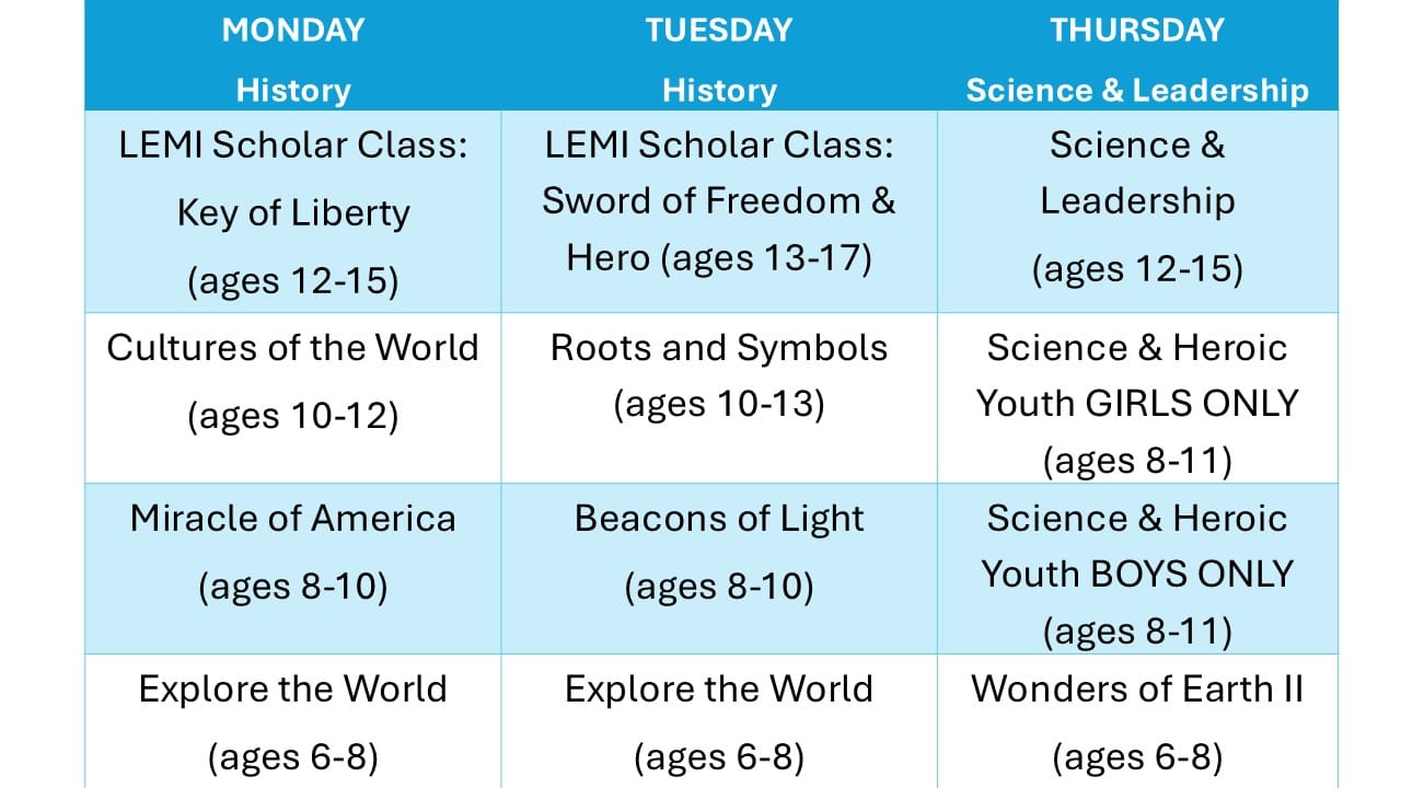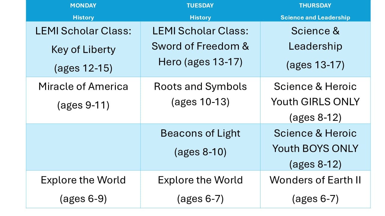Empower your child with the Key of Liberty LEMI Scholar Project! This class dives deep into American history as students study the Declaration of Independence, the Constitution, and Bill of Rights. They learn about the Pilgrims, the Founding Fathers and American Revolutionary War.