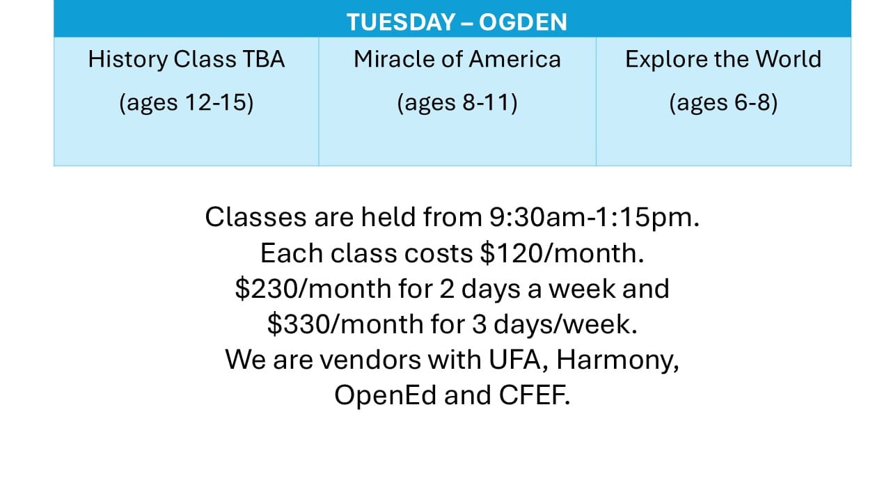 Aspire Mountain Academy is a drop-off microschool that offers history, science, & leadership classes. Our classes also include music and art appreciation, memorizations, handicrafts, nature journaling, inspiring literature, outdoor skills, P.E. games & folk dancing. Outside of class we do regular temple trips, park days, field trips, service projects and more!